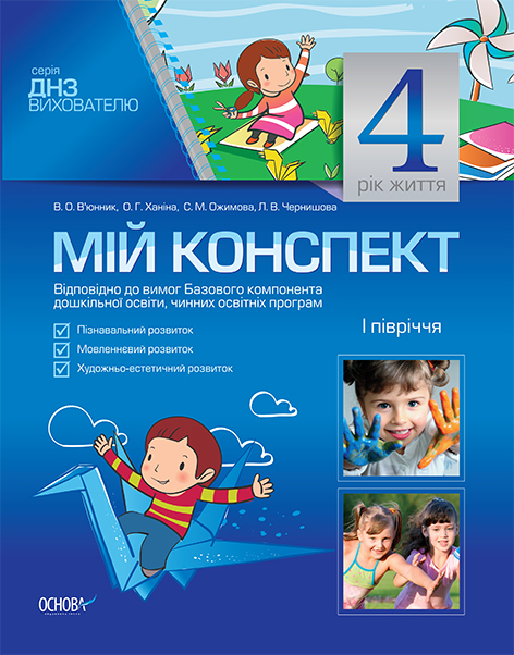 Посібник містить орієнтовні конспекти занять з дітьми 4-го року життя, які реалізують завдання пізнавального, художньо-естетичного та мовного розвитку. Конспекти занять складений за блочно-тематичним принципом планування на навчальний рік, розроблений відповідно до вимог і завдань Базового компонента дошкільної освіти, що діють освітніх програм.