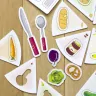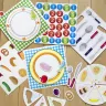 Набір включає 20 розвиваючих ігор + правила здорового харчування, 2 ігрових поля + 24 жетони з продуктами; 4 поля з продуктами харчування, які мають по 6 змінних трикутників-пазлів із зображенням продуктів.