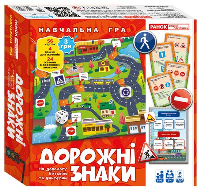 - Містить величезне ігрове поле – 42х42 см! + 24 жетони з дорожніми знаками.